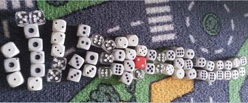 Przychodzimy dziecią z pomocą, bo wystarczy połączyć kostki w ten sposób aby razem dawały 10 i problem rozwiązany. W takich grupach liczenie już nie sprawia kłopotów. Na sam koniec wspólnie liczymy ile mamy dziesiątek wraz z kostkami nie połączonymi w grupy.