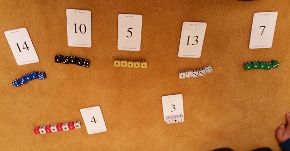 Dziecko losuje z pośród kilku kart liczbę, którą ma następnie ułożyć z oczek na kostkach. Dzieci muszą użyć wszystkich kości, pokazuje tą grę akurat na 5 ksotkach. Bardzo rozwijająca zabawa, która dodatkowo pozwala dzieciom być twórczym, nie narzucamy dzieciom żadnych sum.